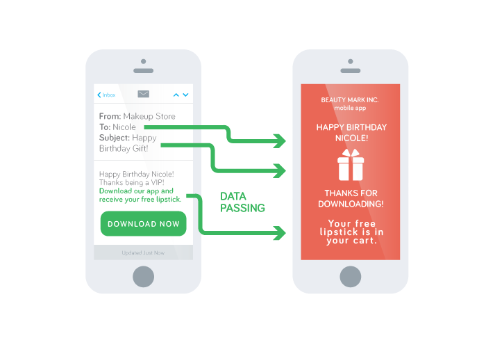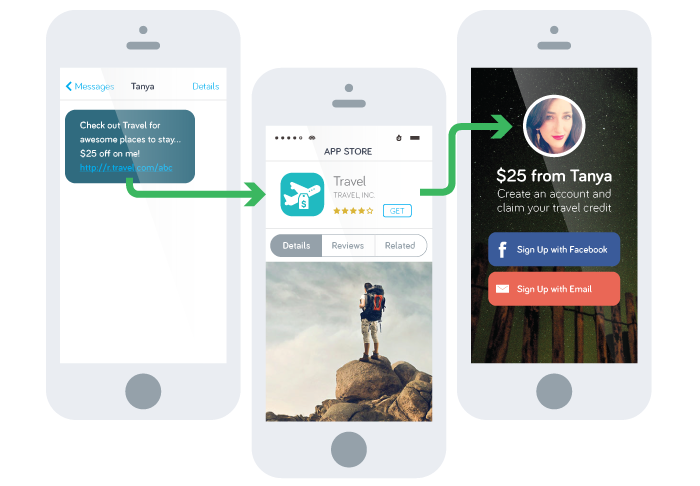 Для этого Yozio построила специальные аналитические алгоритмы. Они учитывают различную информацию, чтобы связать устройство и человека, который нажимает на ссылку. Выглядит это примерно так: «Ваня нажал на эту ссылку, это приложение было загружено на смартфон Вани, поэтому ему надо показать специальные данные».