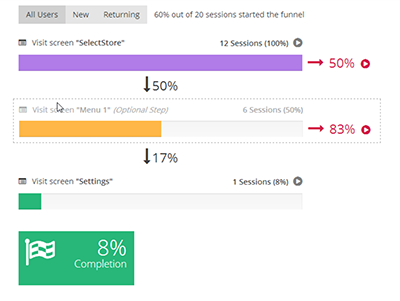 Например, один из наших клиентов, e-commerce приложение, столкнулся с проблемой авторизации через Facebook, которую Appsee удалось обнаружить с помощью подробного анализа воронки конверсии в регистрации.