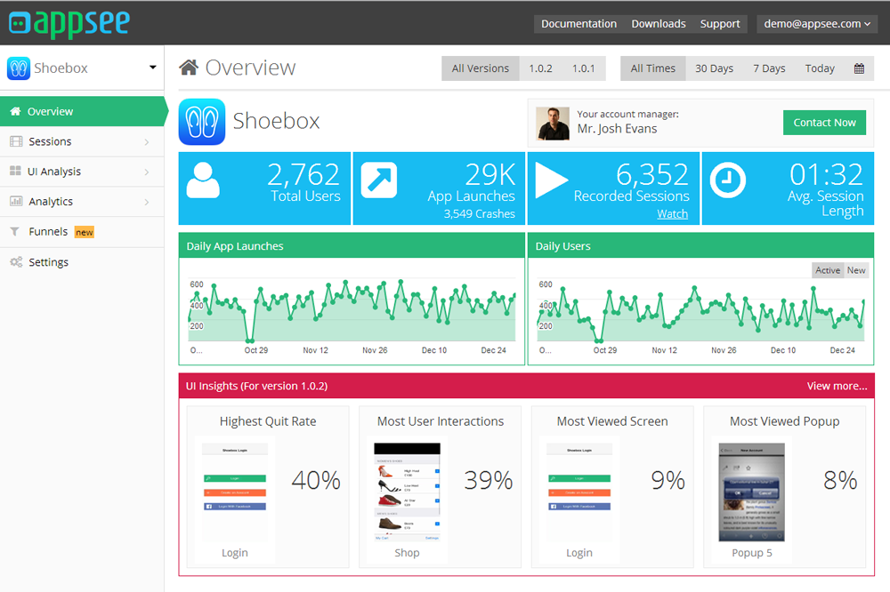 На текущий момент Appsee собирает данные только с iOS-приложений, но есть и SDK для Android, который уже проходит закрытое бета-тестирование. Наша главная цель – запустить универсальную аналитическую платформу для обеих систем. Кстати, сейчас Appsee ищет добровольцев, желающих бесплатно опробовать функционал для Android. Можно скинуть заявку на почту android@appsee.com.
